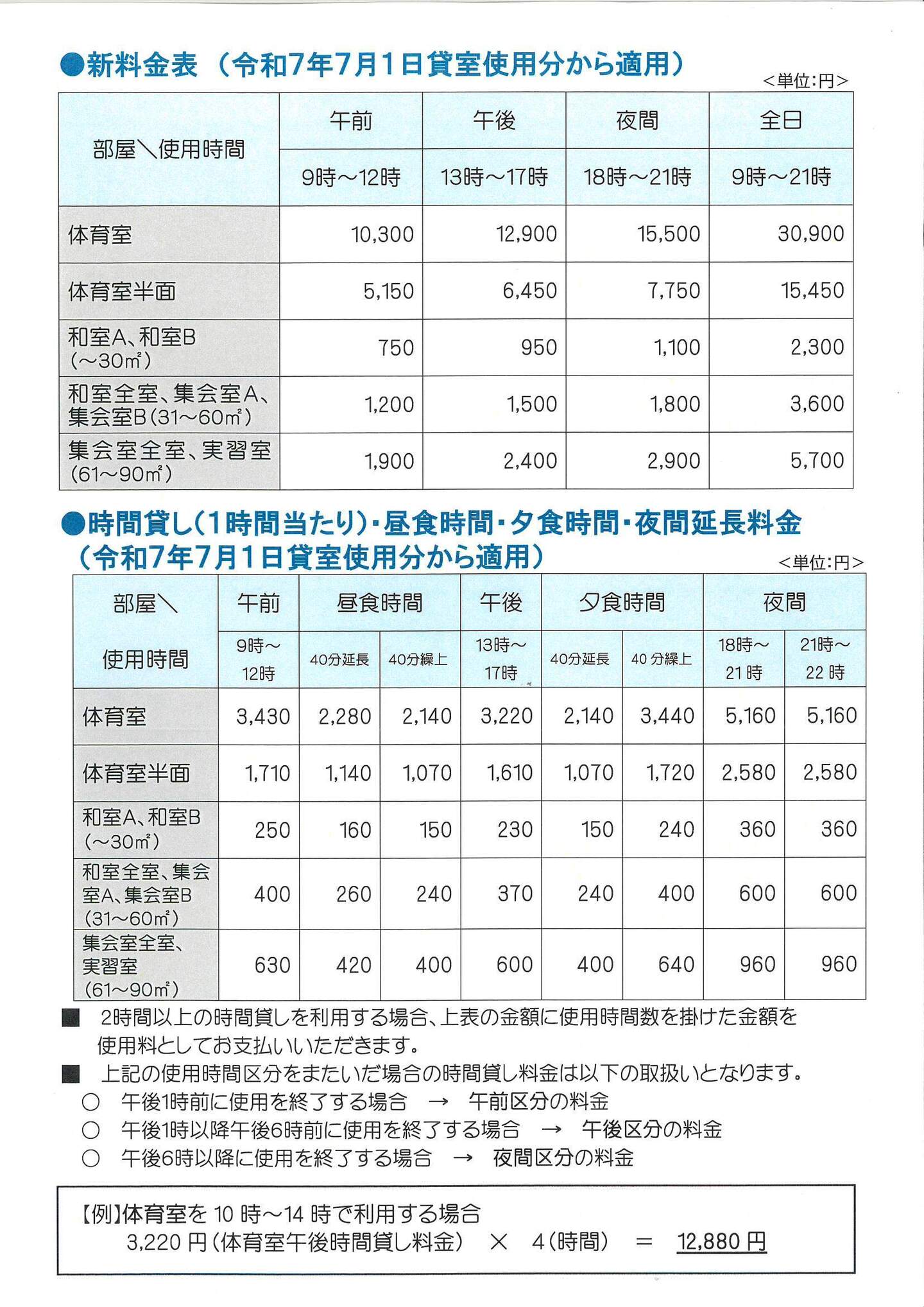 貸室利用料金表(令和7年7月1日使用分から適用)